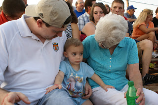 After seeing some fireworks from the boat, we came back to shoot some of our own. Pop-pop and Daddy did all the work. Ben thought the up-close and personal stuff was a little too loud and bright for a really sleepy little guy, though. He fell asleep, amidst it all, in the swing with Nano!